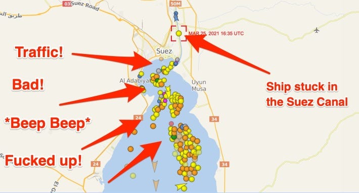 How long will the boat be stuck in the Suez Canal? Who can say? How long has the boat been stuck in the Suez Canal? Also, who can say? (no i will not look this up). Sometimes it feels like there's always been a boat stuck in the Suez Canal. Is this a metaphor for life? Yes. But also, there is literally a boat stuck in the Suez Canal as we speak. And it's fucking things up. Look at this mess: