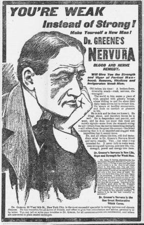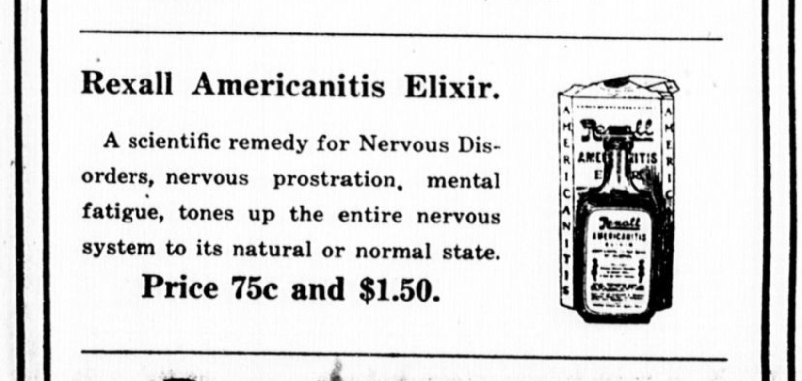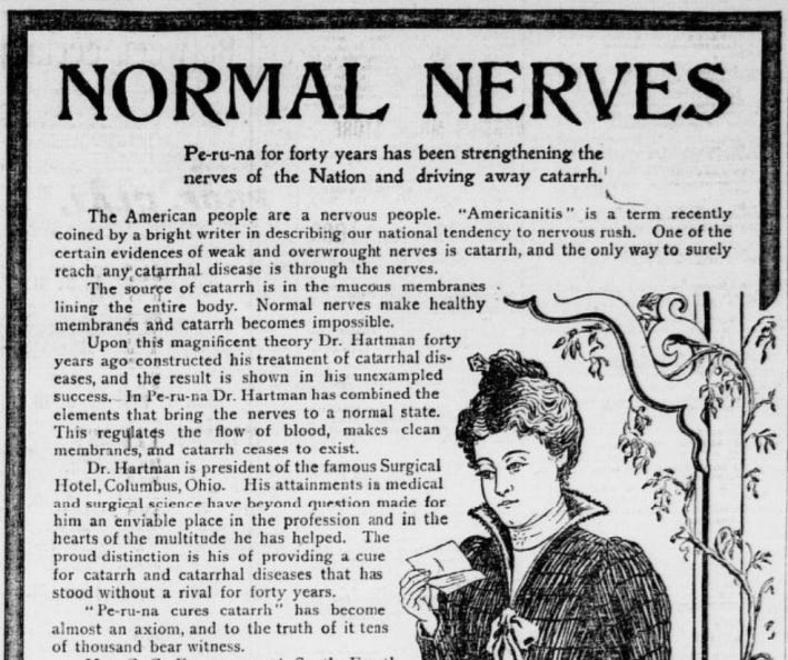 As you can imagine, as soon as Americanitis was given a name, countless snake oil antidotes slithered into the marketplace. Remedies included everything from electrotherapy to reclining chairs, and a whole slew of elixirs (one contained 15 percent alcohol and some chloroform for good measure, while others contained opiates or cannabis). For some context, I looked through dozens of newspapers from this era, and they are chock-full of ads for all kinds of cures for what ails you, even if what ails you isn't specifically Americanitis. There's pills, potions, powders and creams galore.