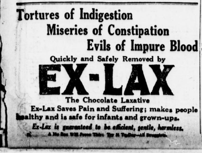 Let us also not forget that this was the era of the dawn of Coca Cola—which originated as a tonic containing cocaine as well as caffeine—and Corn Flakes, which was marketed as a cure for masturbation and a means to achieve dietary purity, whatever that is. In 2021, it often feels like we're living in a particularly bad age of pricey wellness bullshit, but it really is a time-honored tradition in this country. The scam of turning these problems (some simply the byproducts of being alive, some very real mental and physical health issues, some a direct result of a failed social system) into consumer goods has been at work since time immemorial. First you name it, then you commodify it.