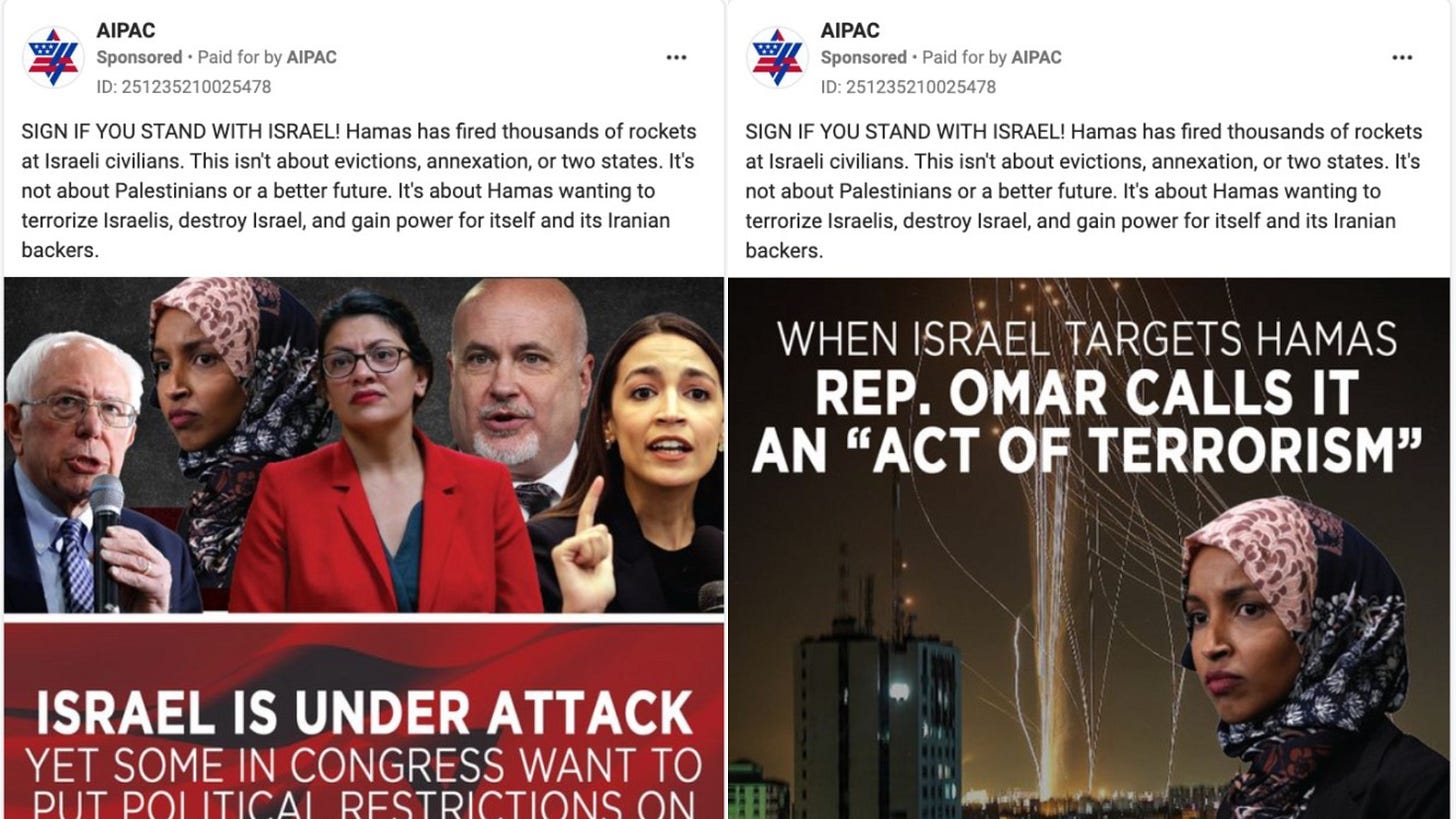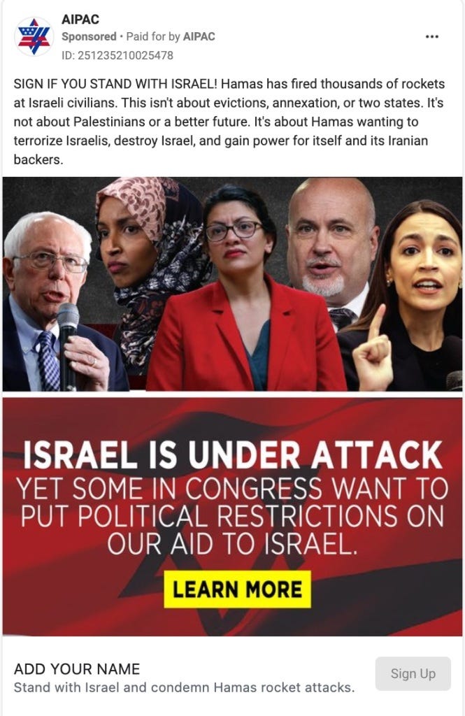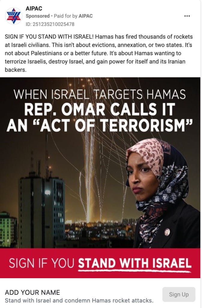 Pointing out the obvious disparity between Hamas rocket squads and a nuclear superpower with fighter jets should, in and of itself, be an incontrovertible matter of fact. And yet, when Congresswoman Ilhan Omar condemned the overwhelming number of Palestinian deaths at the hands of Israel as an "act of terrorism," AIPAC joined the conservative chorus and pounced, using her words and image in a sponsored Facebook post which makes the not-so-subtle insinuation that she, herself, is somehow aligned with Hamas.