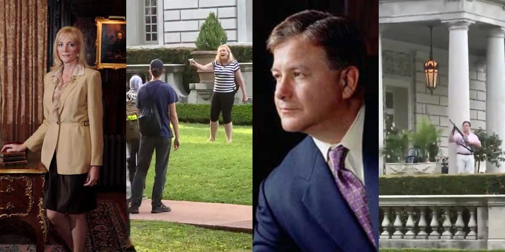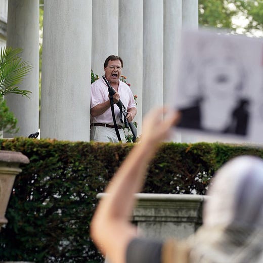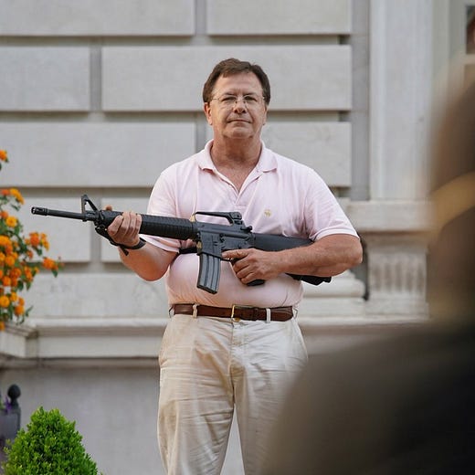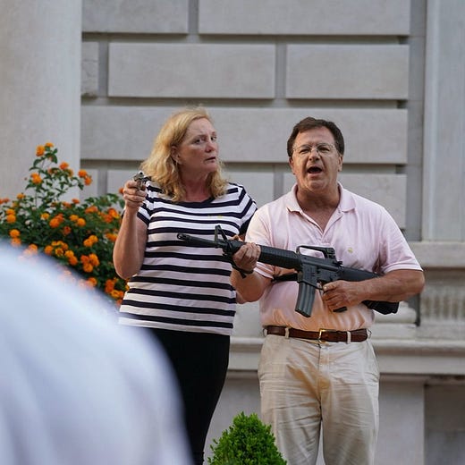 That seems to be what’s happened with Patricia and Mark McCloskey, the white St. Louis couple who brandished guns at protesters marching past their house in a very rich, gated community called Portland Place. (The protesters were making their way down the block toward St. Louis Mayor Lyda Krewson’s house.)