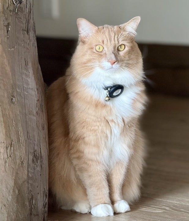 “Okay this is Wonton, he’s my brother's cat who is very beautiful and loves to be told that he's beautiful and knows he's incredibly beautiful. He (until a few months ago) lived in my parents' very spacious mountain home in Utah where he would go anywhere he wanted and be given anything he wanted whenever he meowed his soft meow. He sometimes tried to run out of the house but then ran right back in because he knows his life of luxury. He recently downsized into a one-bedroom apartment with my brother and has been very vocally upset about it. One time he was set up on a date with an older lady cat (Trinket) and was NOT into it, but occasionally stays at a house with an older boy cat (Scamp) and is very visibly upset when he has to leave him. He is two years old and would definitely wear a tux everywhere if he could, and also did watch the 2025 Tonys with more interest than anyone else in my family.”