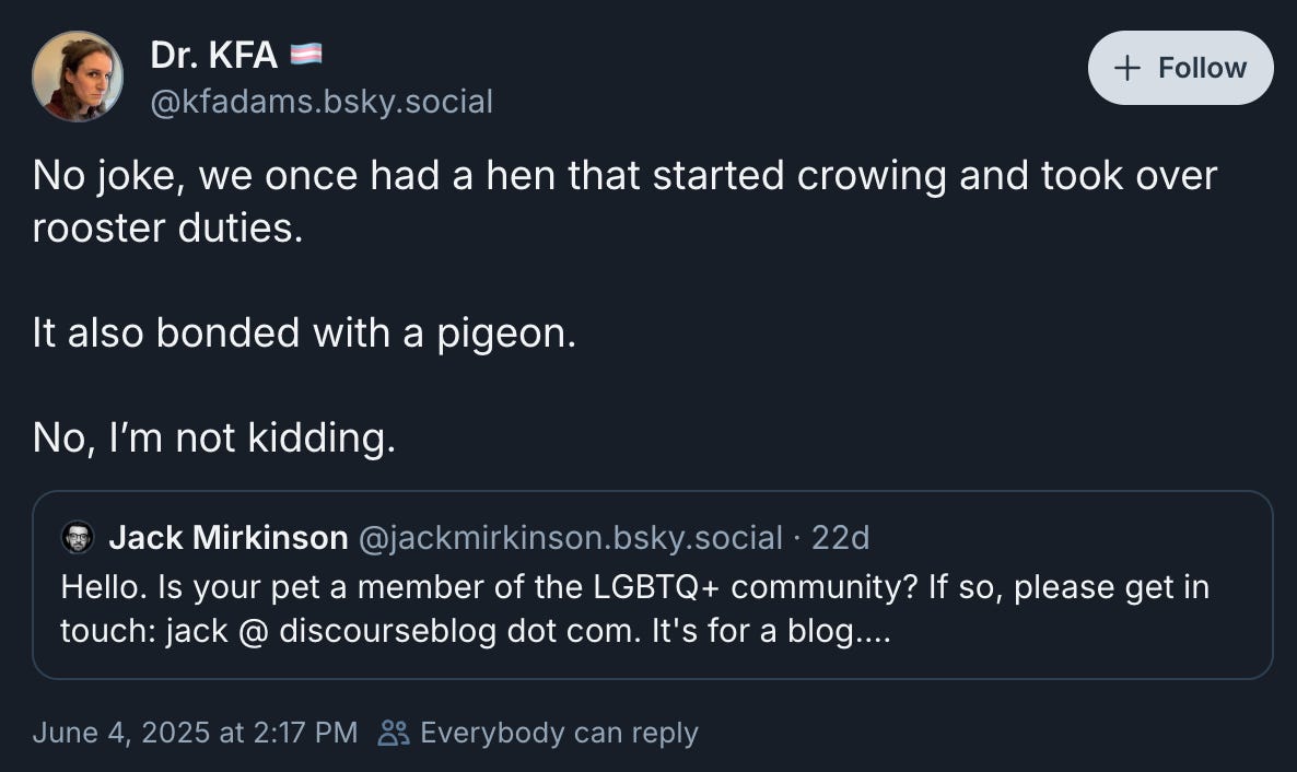 We didn’t just hear about perfect LGBTQ+ animals in our inbox, some of you also reached out on socials, like Dr. KFA who told us about a hen who refused to be cooped in by societal expectations when it came to behavior or socialization norms. What a legend: