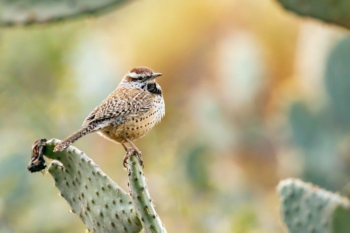 The cactus wren is aptly named in that, in nearly every single photograph I could find of this little guy, he was perched on a prickly succulent. That's inherently cool, it can't be denied.