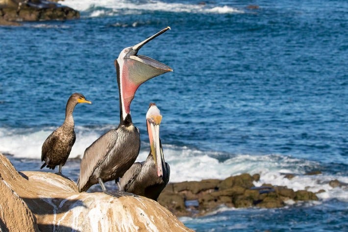 The pelican and its enormous beak are literally iconic. They've also been around in some form for 30 !!! million !!! years !!! They're gregarious. They're distinctive. They're perfect.
