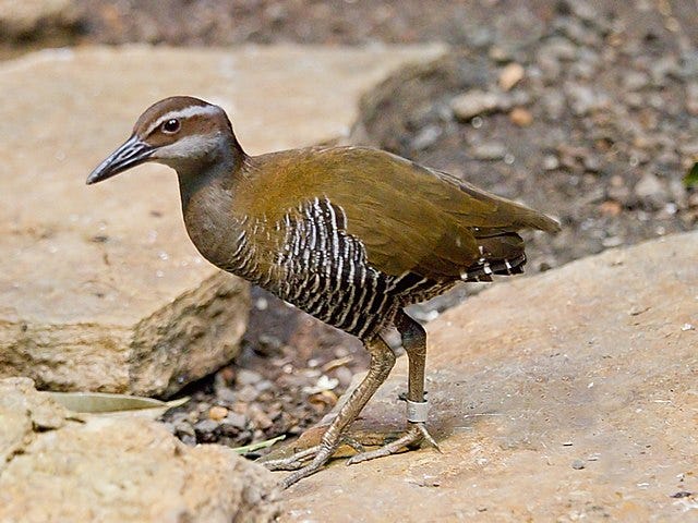 The Guam rail is endemic to Guam, where it's known as the Ko'ko' bird. It was once threatened with extinction, but through conservation efforts, the population has been revived. Still, the Guam rail is categorized as critically endangered so let's all appreciate it and the people who've kept it from going the way of the dodo.