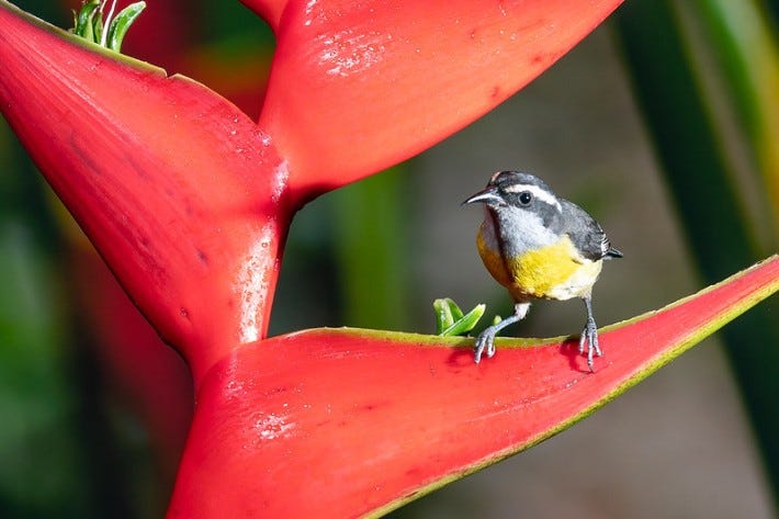 The bananaquit is nicknamed the "sugar bird" for its affinity for fruit and nectar, and is also known for its ability to adjust well to human environments. It's also cute as hell.