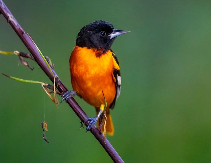 The Baltimore oriole has gorgeous plumage, sings beautiful songs, and gets its name from a resemblance to the colors on the coat of arms of Lord Baltimore. A legend!