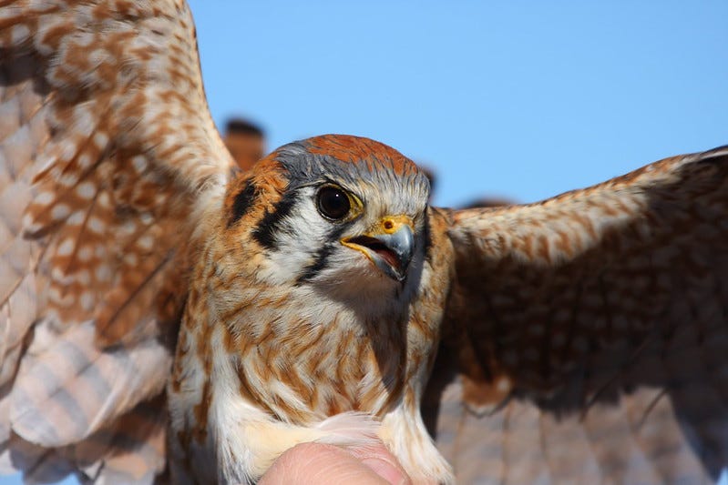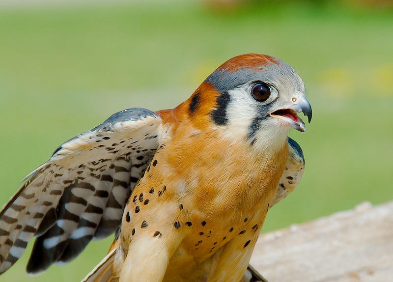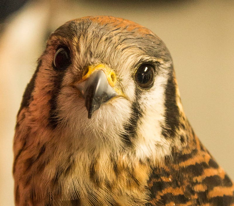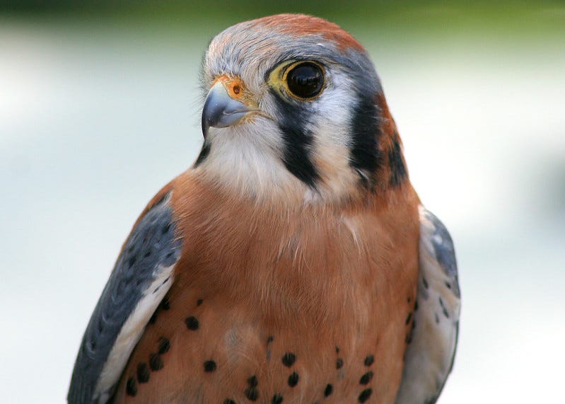American kestrels are a rare kind of falcon where the male and the female have different coloring, but both sexes have pairs of black vertical lines on the sides of their faces, sometimes referred to as a “mustache” and a “sideburn." Ugh, so cool. They also have two black patches on the back of their heads known as ocelli, or “little eyes,” which are designed to confuse predators attempting a sneak attack.