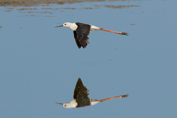 Stilts, you wily bastards! These birds have it all figured out. They don't have to swim around like some common duck, frantically locating fish underwater. They hang out above the surface, surveying the scene, and then they scoop up their favored insects and, from time to time, crustaceans. Here's a great video of a stilt doing that.