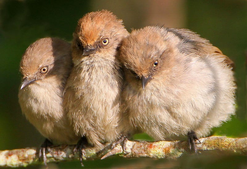 What IS interesting about bushtits is that they’ve somehow flown under the radar for us in terms of being very socialist birds. These guys hang out in large groups and are generally very sociable beings, even happily communing with different species to hunt and find shelter. They’re so friendly, they even cuddle for warmth in cooler months. It’s a necessary measure because bushtits don’t really migrate or change their location as the seasons change. These birds care about the places they live! They are committed to their community!