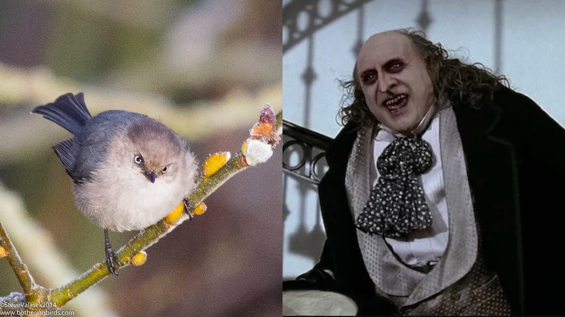 Okay time to end this blog on an unhinged and psycho note because I may have found beauty and peace in the bushtit, but it’s still four days until the election and I’m also absolutely losing my grip on reality. This is not the first time I’ve mentioned Batman Returns in the pages of this blog and it likely won’t be the last: the bushtit also rules because it’s the animal manifestation of Danny DeVito as Penguin.