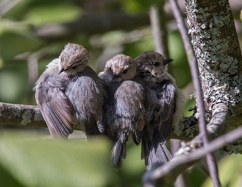 There, in the bush just outside the house, was what I can only describe as a full-on swarm of small gray birds. Realistically, there were maybe 10 of them, but it felt like 100. They were flitting about, chirping, flapping, hopping, and generally going ballistic. I realize this might sound boring as hell, but I really cannot overstate how absolutely startling and enthralling this sight was. I stood at the window and stared for several minutes, gobsmacked at this small wonder, observing every movement while knowing I could barely keep up. I looked back at Quinn, and he looked back at me, knowingly, before returning his gaze to the window.