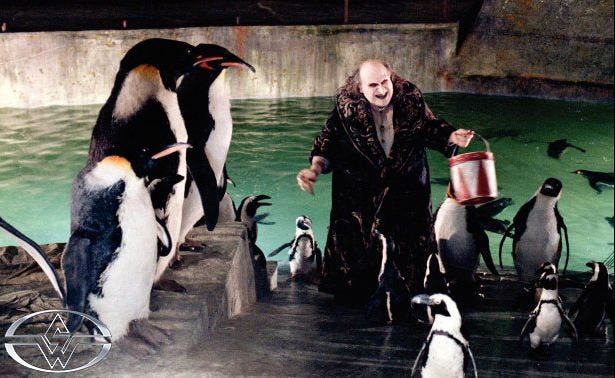 I feel obligated to note that I still hold a very deep and powerful sense memory from when I first really clocked emperor penguins. It was when I saw 1992’s Batman Returns—a lightly disturbing and all-time great film—for the first time. (If you’re curious here’s a very cool piece about how the production team created The Penguin’s penguin army.)