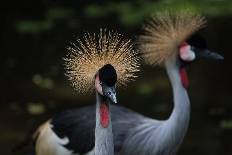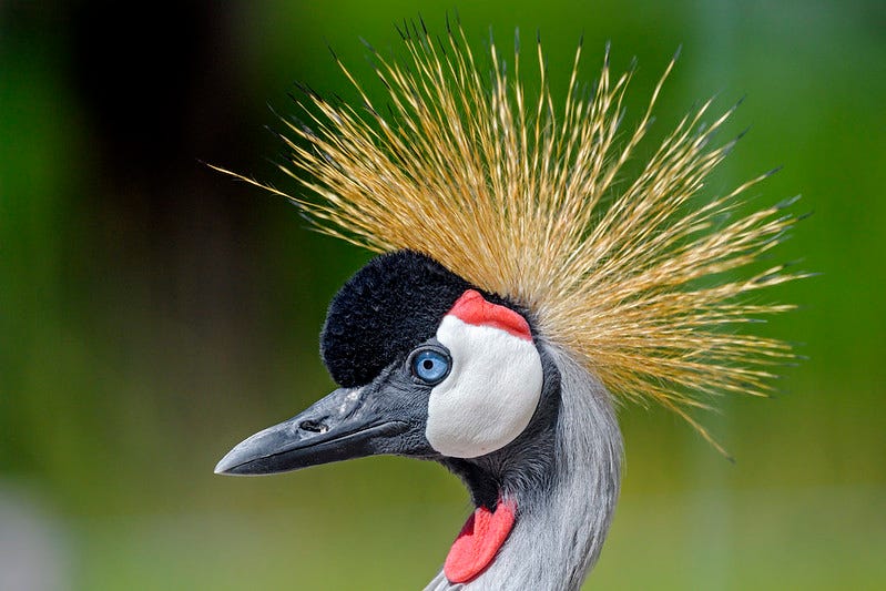 The gray crowned crane is also known as the African crowned crane or East African crane, among other names, which makes sense as it resides in East Africa and is the national bird of Uganda. It even appears on the country’s flag—though that symbol has its origins in British colonialism, so take from that what you will. Fuck the British and fuck colonizers everywhere, but it’s not the bird’s fault that militarization put its beauty to use. It certainly deserves the pedestal it's been placed on.