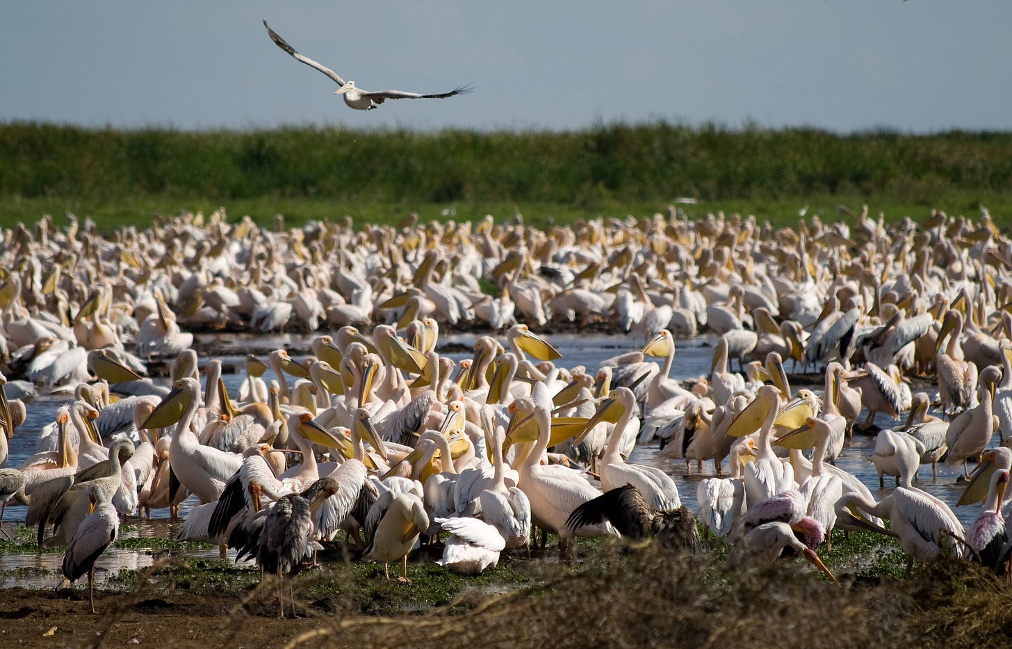 The second advantage great white pelicans have is their love of fishing in tightly clustered groups. They move together almost as a single unit as they skim the surface of the water for their meal. (Other pelican species have different methods.) Here’s a video of that: