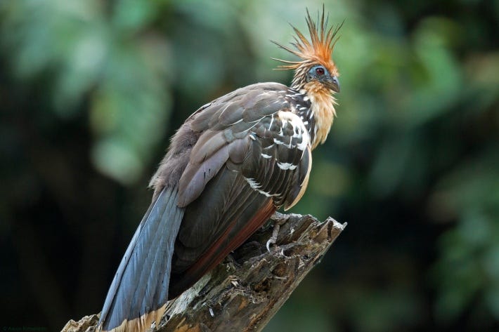 Hoatzins are pretty literally like nothing else in the universe. They are definitely birds, but—twist number one!—they are also kind of like a cow? Here is the New York Times in 1995 (emphasis mine):