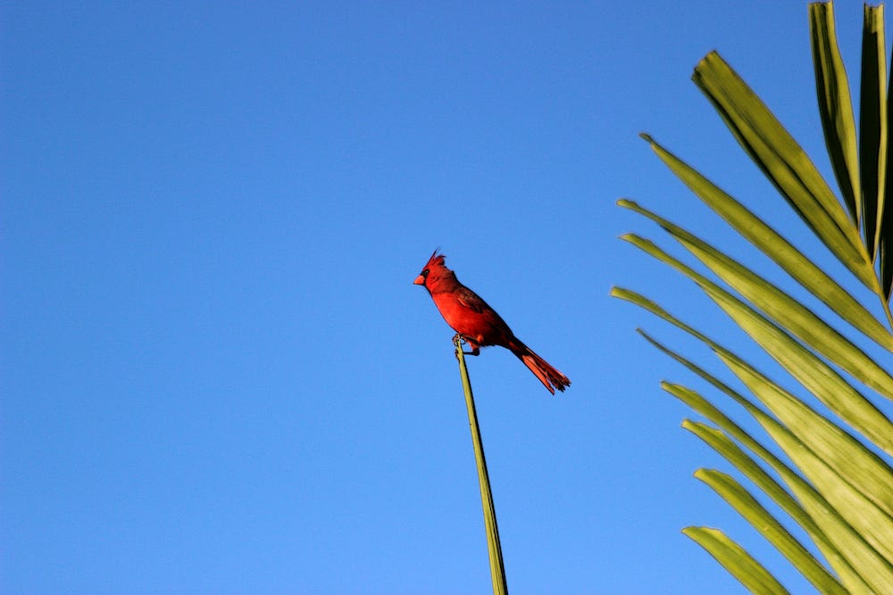 There’s two reasons I think it’s weird we haven’t done the northern cardinal yet. The first is that we’ve profiled members of the broader cardinal family before—but never a bird that’s like “I am a straight-up cardinal.” Kinda weird, nearly four years into this thing!