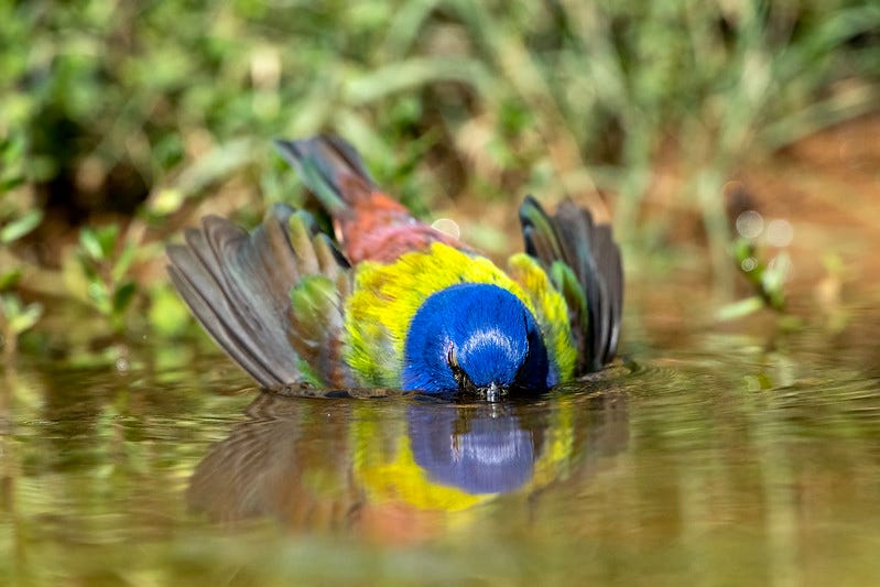 A living, breathing, chirping watercolor! Painted buntings are flawless songbirds that are native to North America and are part of the cardinal family. They tend to be shy and secretive, staying hidden in places with dense foliage. Very humble of them to keep their beauty away from the rest of us, where it would be too distracting and make us feel too bad about ourselves to keep living life as usual.