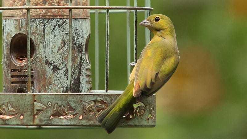 Now, you don’t get by looking this good and not gaining some nicknames along the way. The painted bunting is commonly referred to as siete colores or “seven colors” in Mexico and nonpareil (“without equal” or “unrivaled” in French) in Louisiana. Again, fair. Even the females (chronically the duller bird sex, aesthetically) are a total stunner: