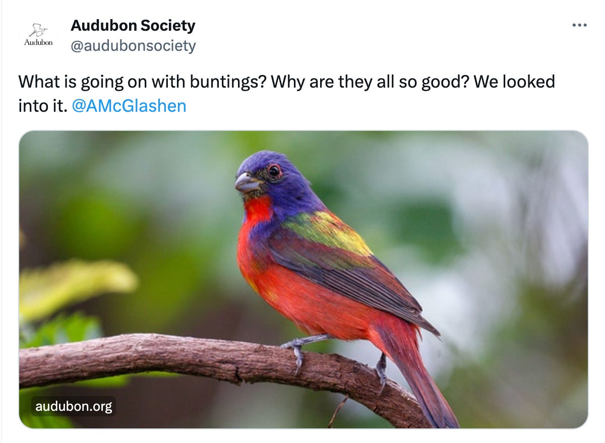 Buntings are very good birds. I have reliably seen indigo buntings in NY and NJ and am delighted every time.