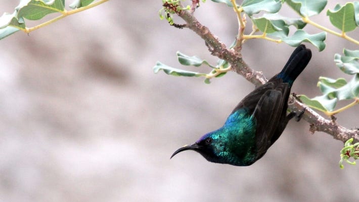 The sunbird is part of the Nectariniidae family, which means, guess what? It loves nectar! (Also insects, but especially nectar.) It has a big, curved beak designed especially to get at the nectar. Here's a cool video of a sunbird doing its nectar thing, as well as showing off its trilling call. (I love bird calls!!!) According to Haaretz, the sunbird can distinguish between the sugar content of various flowers when trying to figure out its next meal, and can sing in several different sunbird dialects.