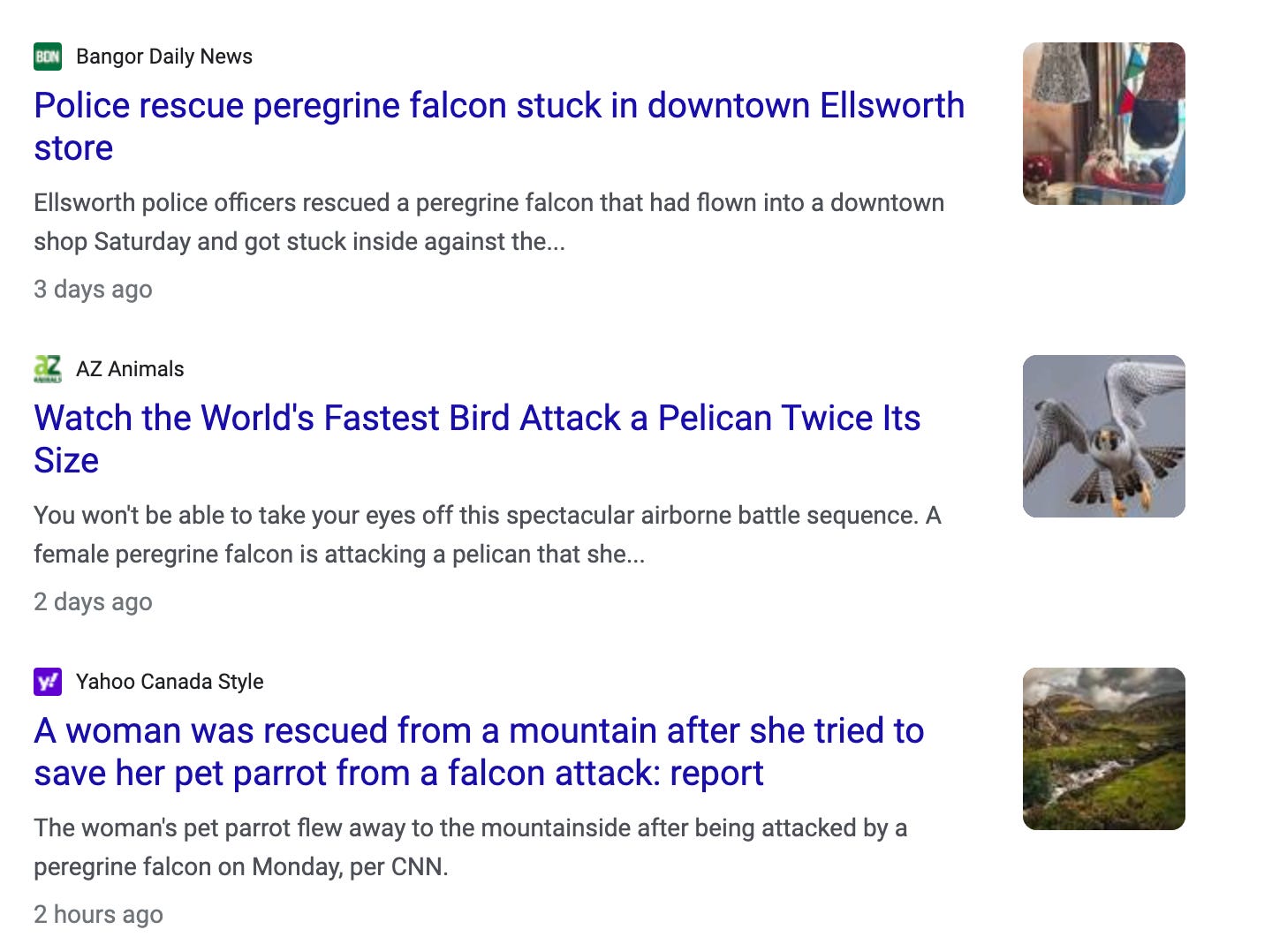 Okay, I could go on, but I’d be remiss if I didn’t mention one final thing that really solidifies the peregrine falcon as That Girl. It’s in the news constantly! Just look at the stories from this week alone: