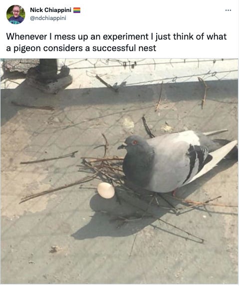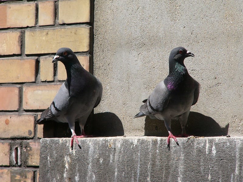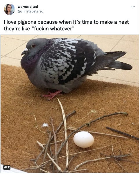 Pigeons are loyal, mate for life, engage in elaborate courting behaviors, and co-parent like socialist champions. They even produce “milk” for their young because I guess they wanted to know what it was like to walk in another species’ shoes. Beautiful. And probably the single greatest fact about pigeons, among many great facts, is that they build hilariously bad nests that are actually good. What humble kings.