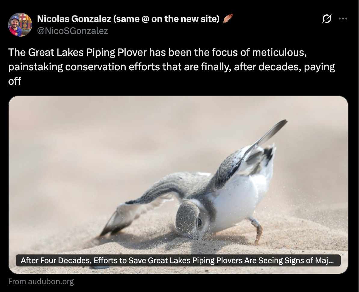 This story is amazing. Great Lakes piping plovers were declared endangered in the ‘80s, and in the decades since, conservationists have put in a stunning amount of work that is finally yielding results: The plover population went from just 12 plover pairs along the Great Lakes at its lowest point to 85, a record breeding number that was just hit in 2025.