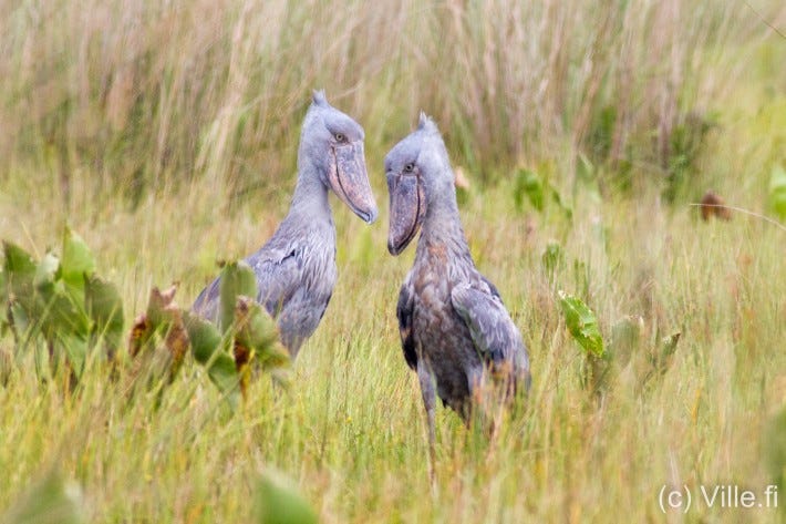 Looking at the shoebill sends me spiraling. Somewhere in the world—well, the swamps of central and eastern Africa, to be precise—there is a creature, walking around, alive, and it looks like this. It is a real and existing thing in the universe. It breathes the same air as you or I. Natural selection never fails to blow the mind. Let's see another two pictures.