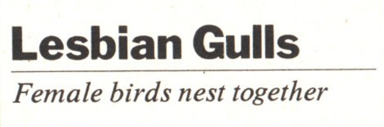 Anyway, the study confirmed what we now take for granted: some animals are gay. And that is why Lesbian Seagull Island is so important. Why were the seagulls lesbians? People have many theories, but I say: who cares. Seagulls get to be lesbians too.