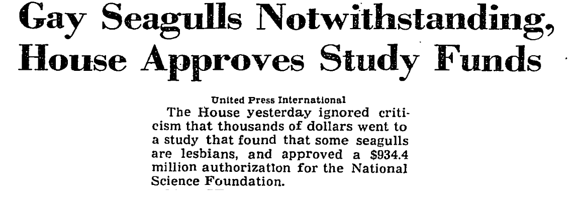 To say there was a big reaction to these findings would be an understatement. True, the bar is low when it comes to public interest in seagull studies, but even so. Here is a 1977 headline from the New York Times.