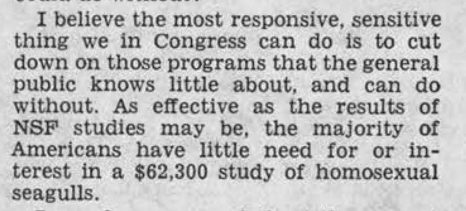 Hunt got a stack of mail several inches thick—some of which he still has not read. Gay men and women wrote him in thanks. Conservatives wrote him in fury. An Orange County business owner took out newspaper ads condemning the research, which was partly funded by the National Science Foundation. Congress guffawed, waving the gay gull study aloft as another example of federal folly. An unscientific citizens task force in New York—obviously eager to dismiss the gull colony as one more California quirk—proclaimed that 100% of the sea gulls in the five boroughs of New York City were heterosexual.