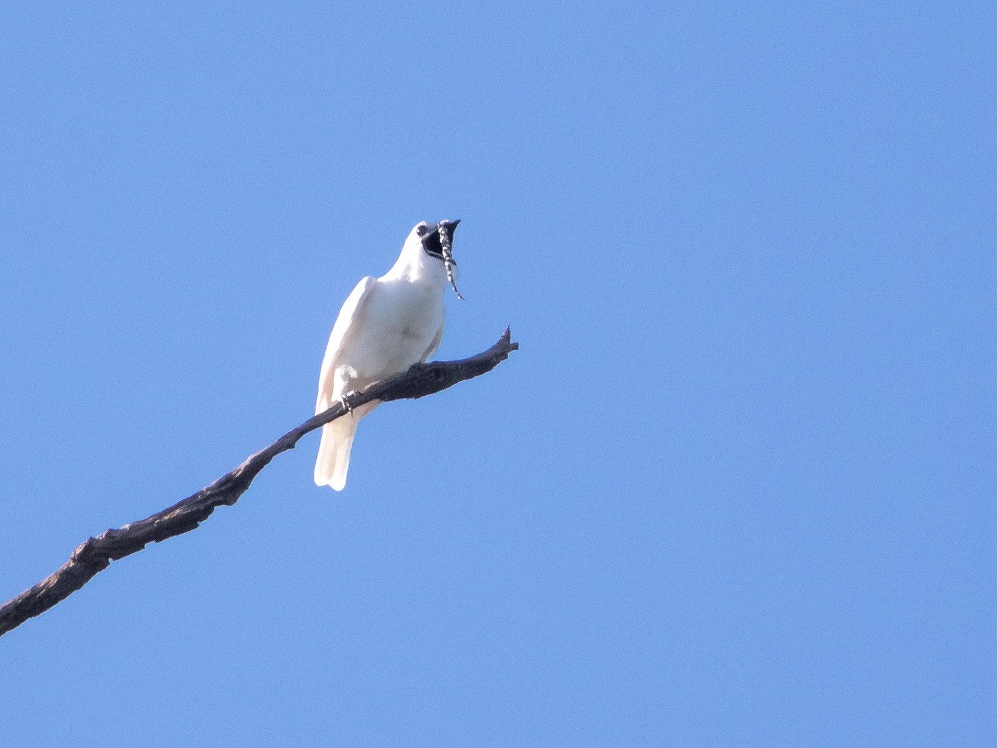 You will, I’m sure, have noticed three things about this bird. One, it is white. Two, it has that whatever-it-is dangling off its face. And three, it appears to be screaming.