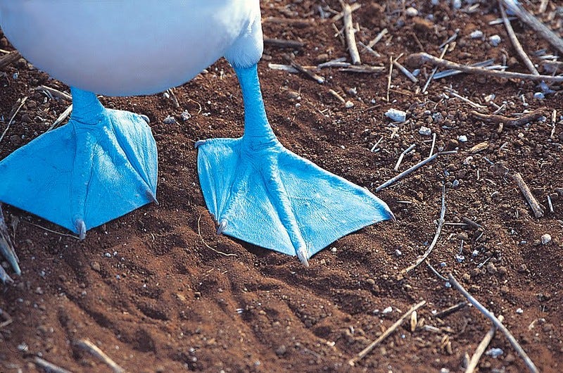 I imagine that if you don’t already know the origin, you’re probably fixated on the “booby” of it all. Fair! The name comes from the Spanish word “bobo,” meaning silly or foolish. It was foisted upon these birds by European colonists who considered them clumsy, but (shocker) it was the colonists who were the fools. They were observing the birds on land, which is not their natural environment! The settlers were also mocking the birds for their lack of fear of human beings, which is really rich on a number of levels. I think we can all agree, fuck them. Let’s not waste more time on those stupid humans. We’ve got FEET to discuss.