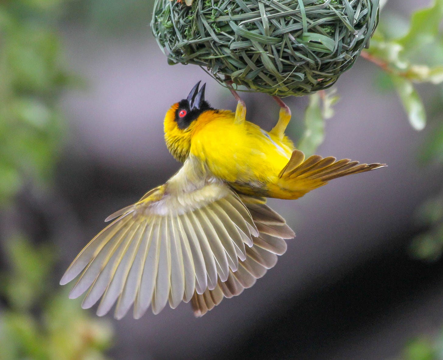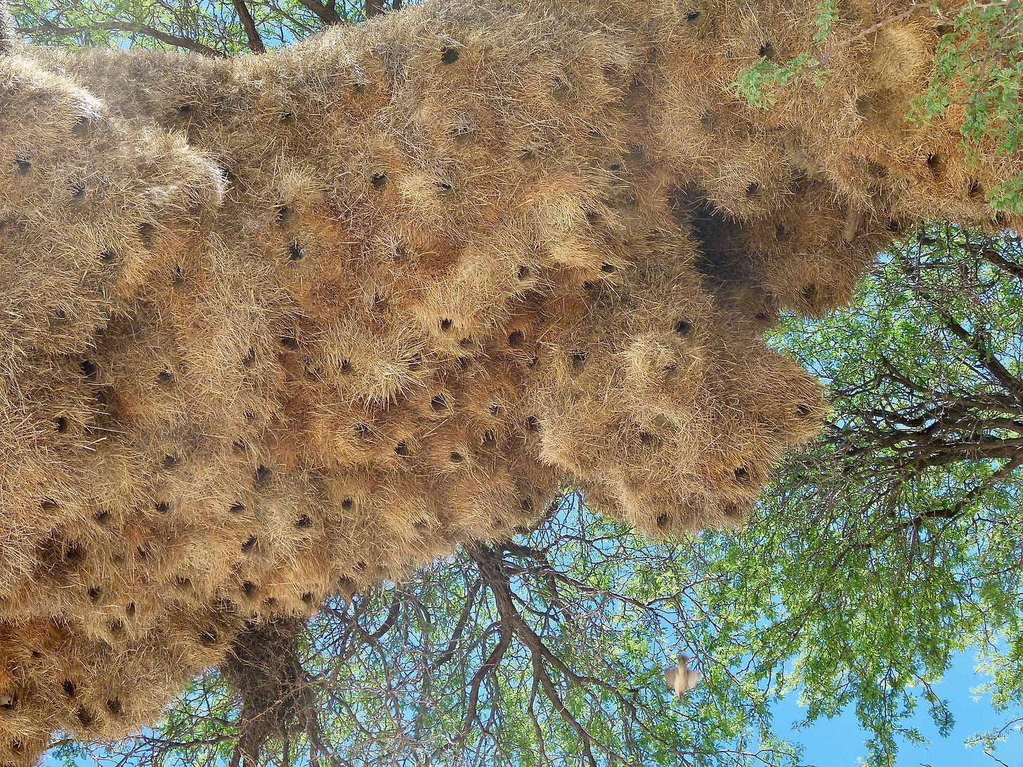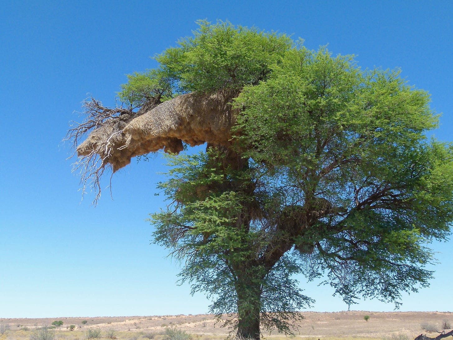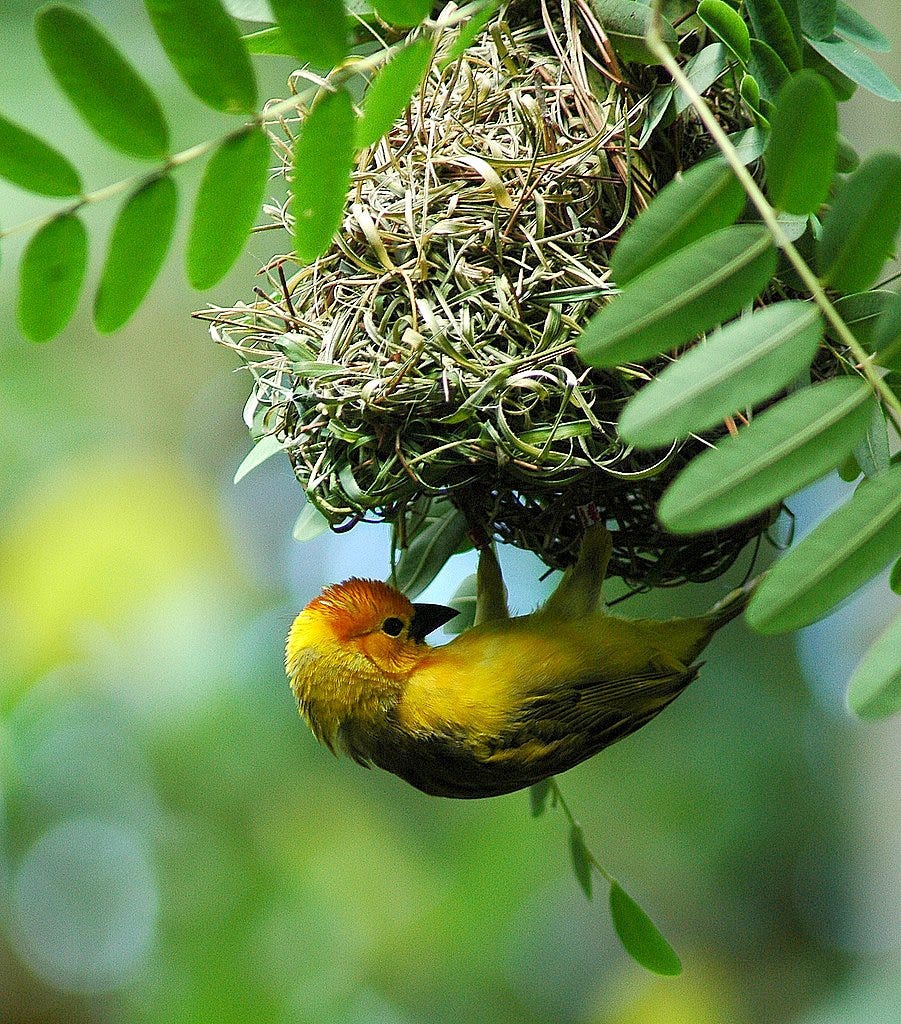 Yes, the name “weaver” comes from the fact that these birds quite literally weave their nests together. Male weaver birds construct stunningly elaborate structures out of thin, woven strips of leaves, and then female weaver birds operate as high-stakes architecture critics, selecting a mate in large part based on the worthiness of their nests. (Here’s a fun David Attenborough video showing the process.) One breed of weaver, the sociable weaver, goes even further, creating vast communal nests in trees that house hundreds of weavers all at once like a giant bird apartment building. It’s incredible!!!!