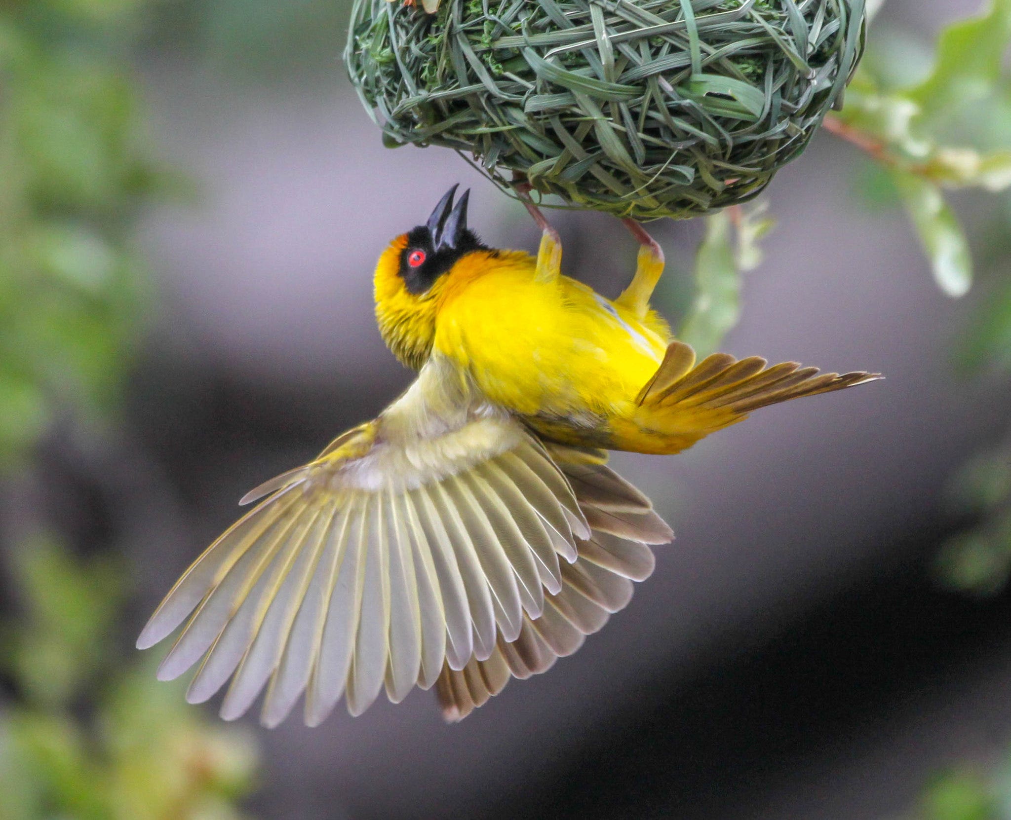 Weavers are small songbirds who mostly live in sub-Saharan Africa. Unlike, say, some other songbirds we have covered recently, they primarily eat benign things like seeds (though sometimes they will snag an insect for a meal). They’re not out here trying to kill everything that comes their way! They just want to live their lives and, most spectacularly, build their nests.