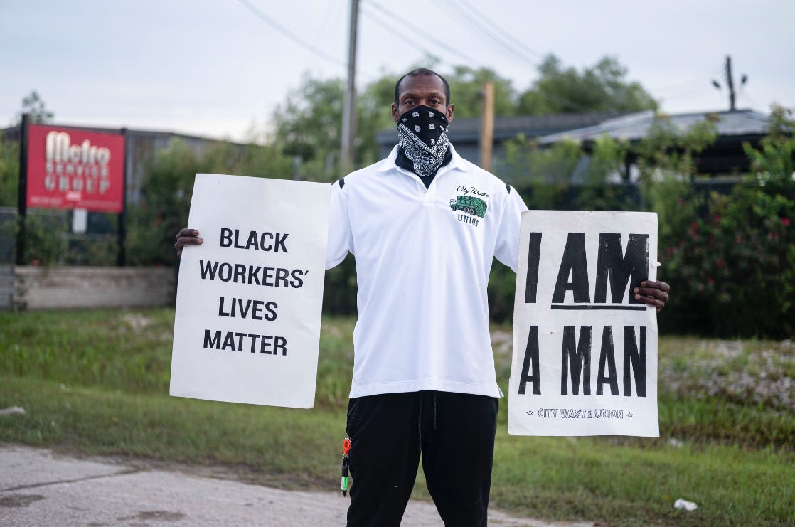 It was that 1968 sanitation strike, ignited by the death of two Black sanitation workers, that popularized the slogan “I Am a Man.” And it is that 1968 sanitation strike that is the inspiration for the striking New Orleans sanitation workers today.