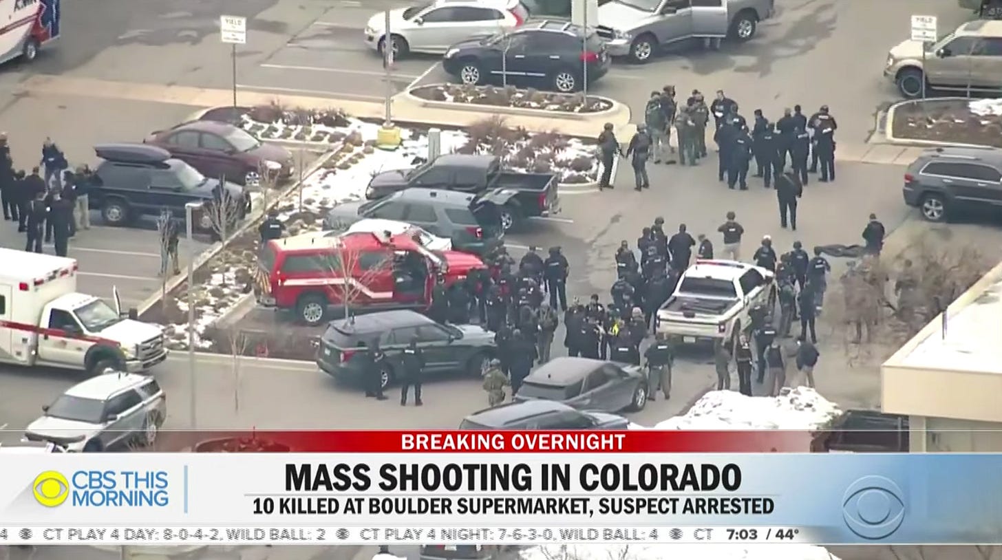 On Monday night, a gunman killed ten people at a Boulder, CO, grocery store. This follows the horrendous massacre of eight people at a string of Atlanta-area spas last week…