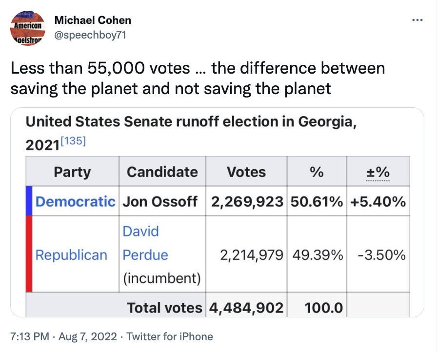 Yes, ring the bells, set the fireworks off, Democrats in Washington have, lemme see if I’m reading this correctly, “done something”??? After over 18 months of hell, and the headfake to end all headfakes from Joe Manchin, Senate Democrats passed the Build Back Better Inflation Reduction Act on a 51-50 party line split, with Vice President Kamala Harris casting the tie-breaking vote. (And yes, every time I write something like “51 Democrats back the IRA,” it is funny to me.) Among other things, the IRA (lol again) contains the biggest government investment in American history in the fight against climate change; the consensus is that the climate provisions in the bill will cut emissions by around 40 percent by 2030. The IRA (sorry, but it’s still funny) will also allow Medicare to negotiate the cost of some prescription drugs and will raise some taxes on big corporations.