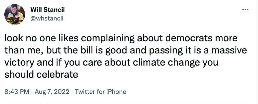 Well, I am here to tell you: the planet has not been saved. It’s OK to criticize the bill. And you have every right to demand more from your government, even when it makes progress on something important. These shouldn’t be difficult ideas to process, but here we are.