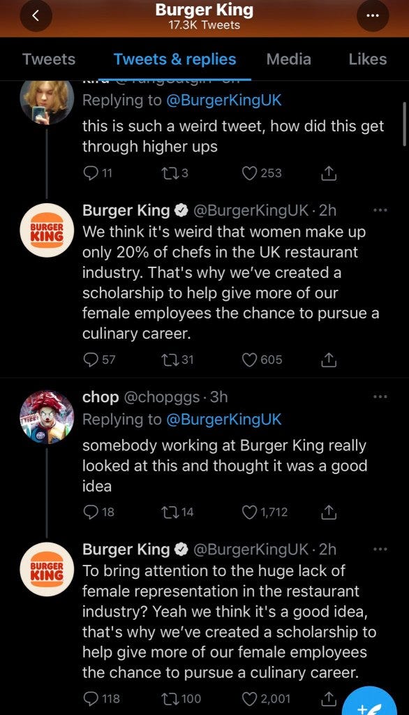 When someone wondered bafflingly that someone thought Burger King UK's initial tweet was a good idea, they replied, "To bring attention to the huge lack of female representation in the restaurant industry? Yeah we think it's a good idea, that's why we've created a scholarship to help give more of our female employees the chance to pursue a culinary career."