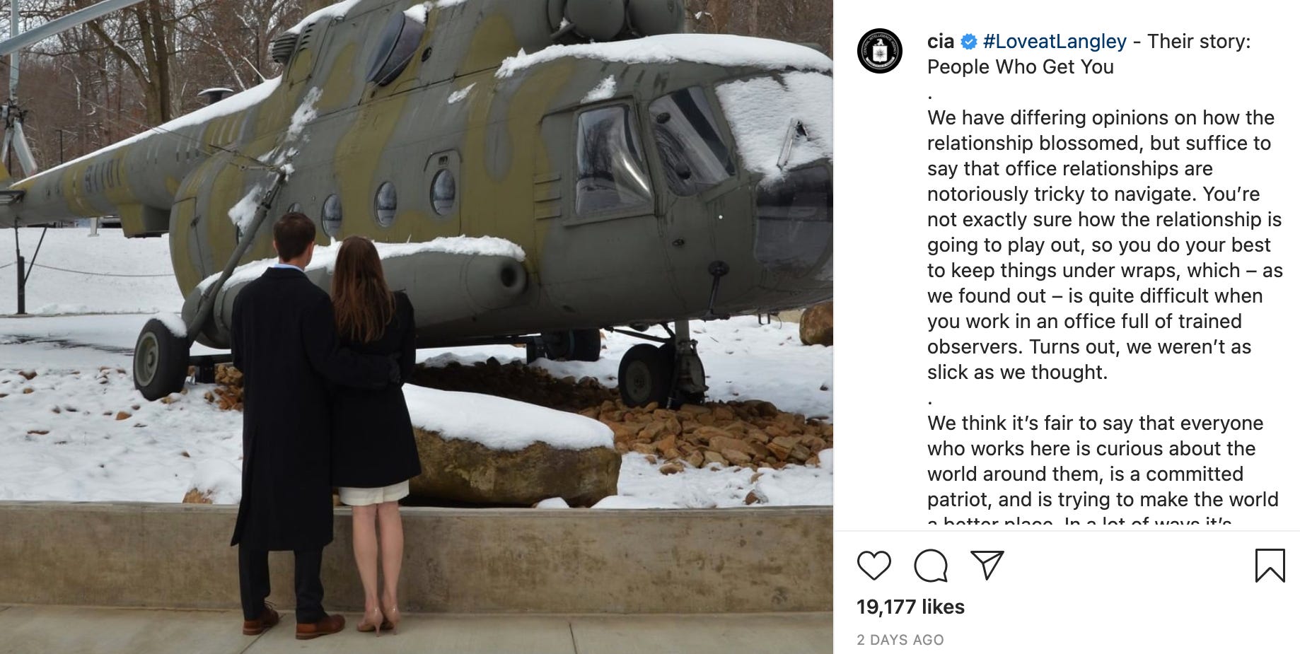 You may say this is being unfair, that if I'm not judging the DOI on its worst behavior (like when Ryan Zinke used it to sell bits of Alaska) then I shouldn't judge the CIA on its worst (dozens of coups, targeted assassinations, drone strikes of weddings). The difference to me is that in an ideal world, the Department of Interior's function is still an important and positive one, whereas the secret service of any government is inevitably going to do shit that should not be on Instagram. But it's in the department's interest to, you know, "humanize" its employees (many of whom dehumanize America's enemies for a living), so this is what you get. CIADate: where operational security means you have to crop the faces out of your PR pictures.