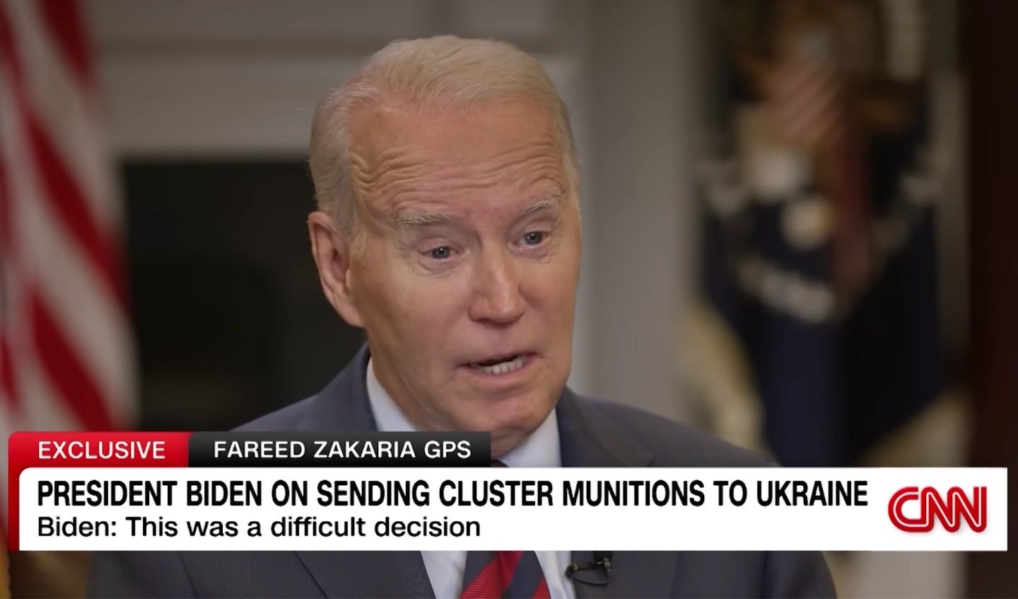 I say this because, on Friday, the Biden administration announced that it is sending cluster munitions to Ukraine as part of a new $800 million arms package.