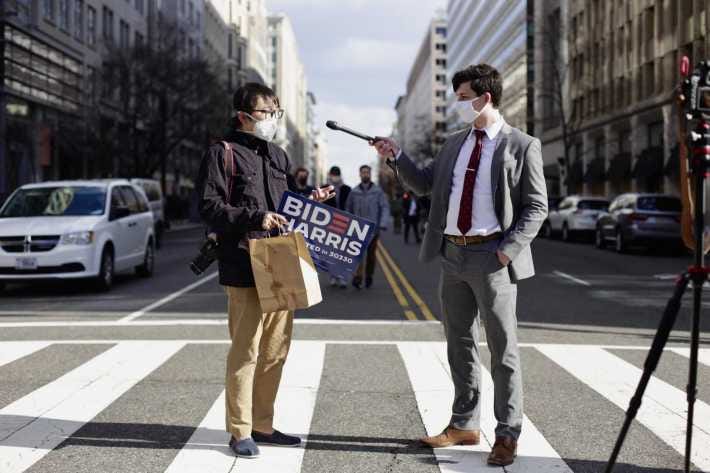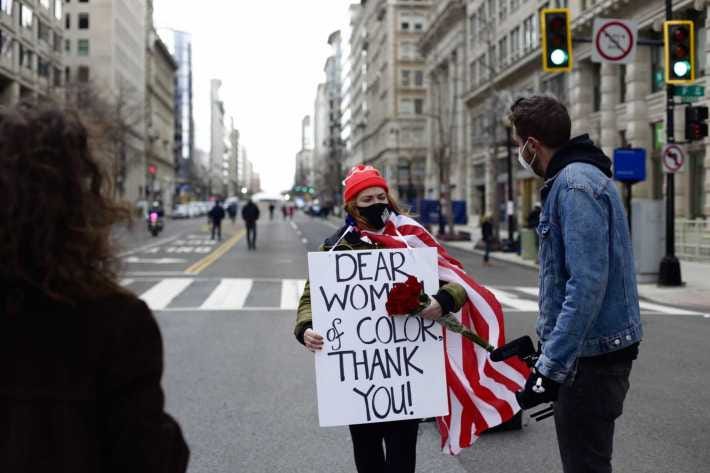 They had a point: for most of the people milling around between the fences outside of Joe Biden’s locked-down ceremony, Inauguration Day can’t have been that fun. Mostly, you stood in line, and if you weren’t a journalist, you got approached by an endless line of journalists. A group of Black women wearing the letters of Kamala Harris’ sorority were particularly popular, holding court to a throng of photographers and TV crews as they cheered while watching a video feed of the ceremonies on someone’s phone.