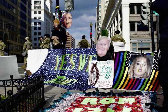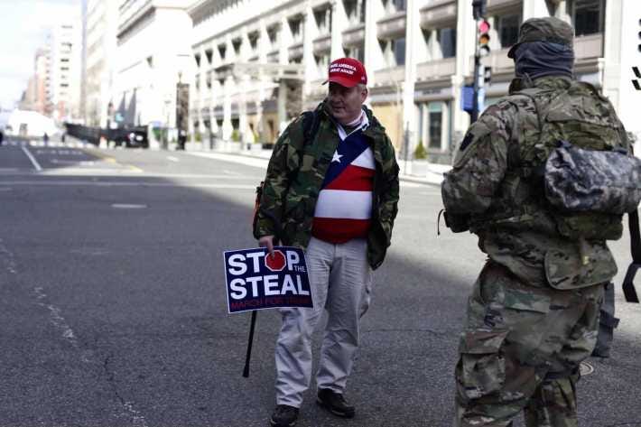 An old man in an American flag t-shirt marched slowly from checkpoint to checkpoint, chatting with the national guard and stopping for interviews, a crisp “STOP THE STEAL” sign tucked under his arm. A woman with a sequined jacket and a thick South African accent recited a dream diary she had jotted down on her phone into another phone, which was streaming her on YouTube. The dream, it sounded like, had something to do with demonic spirits and Joe Biden and Kamala Harris’s involvement with the Illumniati. A man wearing leather work gloves and an NRA baseball hat ate a ham and cheese sandwich out of his backpack.
