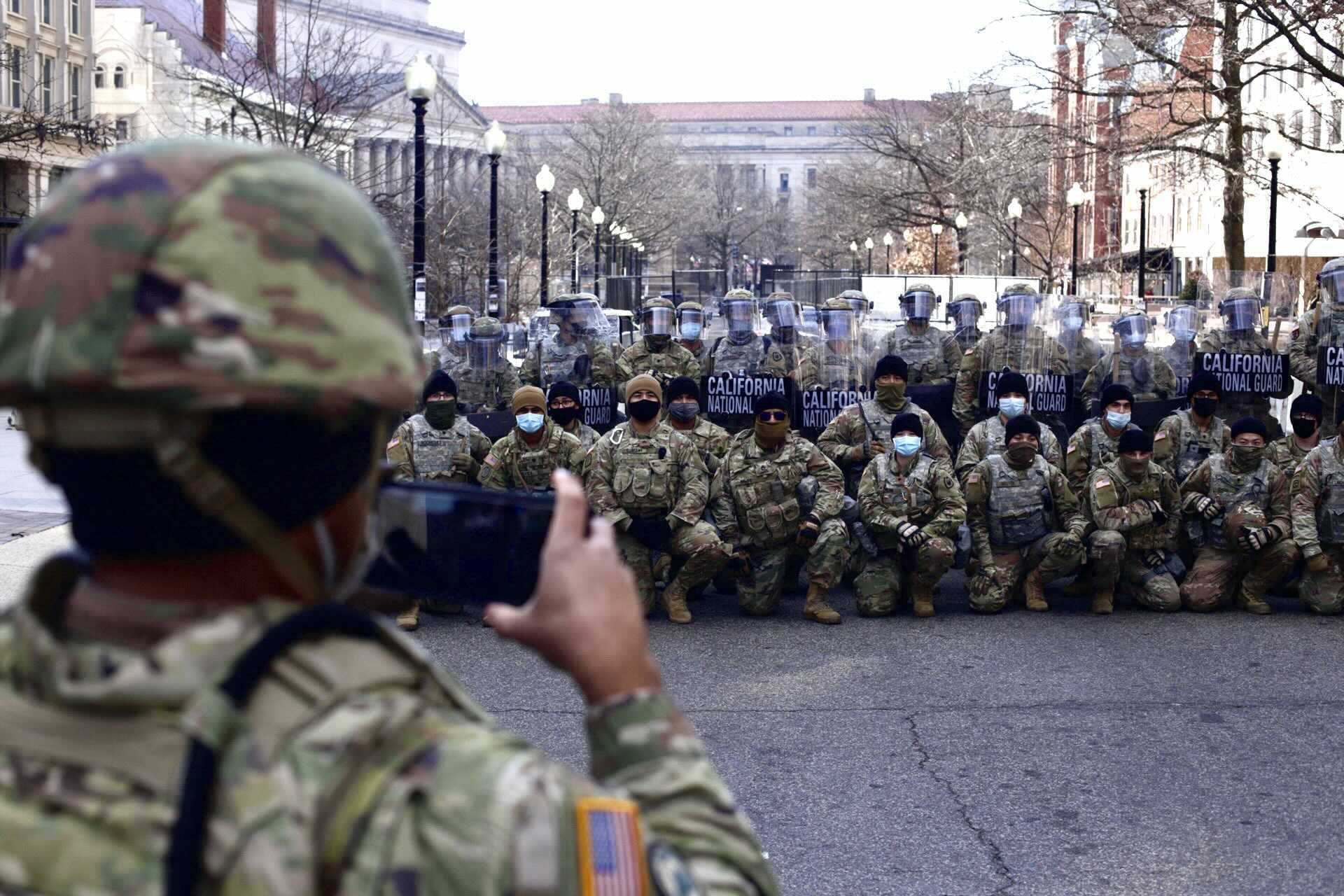 Towards the end of the afternoon, over on the outskirts of Capitol Hill, I spotted a long column of California National Guard soldiers marching toward me, dressed in full riot gear in mint condition: shields, batons, Rawlings baseball catchers’ shinguards, helmets with clear, unmarred face shields, never before worn. They looked purposeful, focused. For a moment I thought that there was an actual threat. They marched down the hill in two files, clustering with another group of guardsmen on a side street that had a clear view of the Washington Monument. Then they knelt for a team photo.