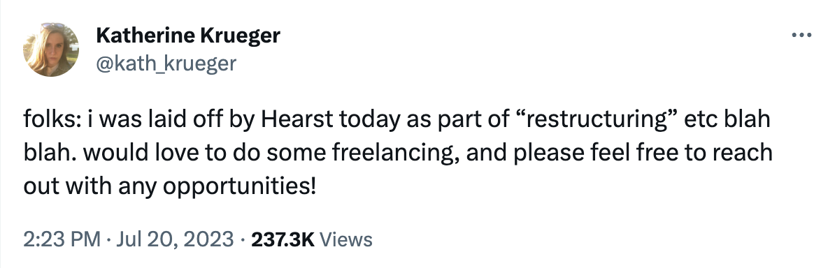 I speak, of course, of Katherine. On Thursday, she was laid off from her job at Elle along with at least 40 other people across the Hearst media empire.