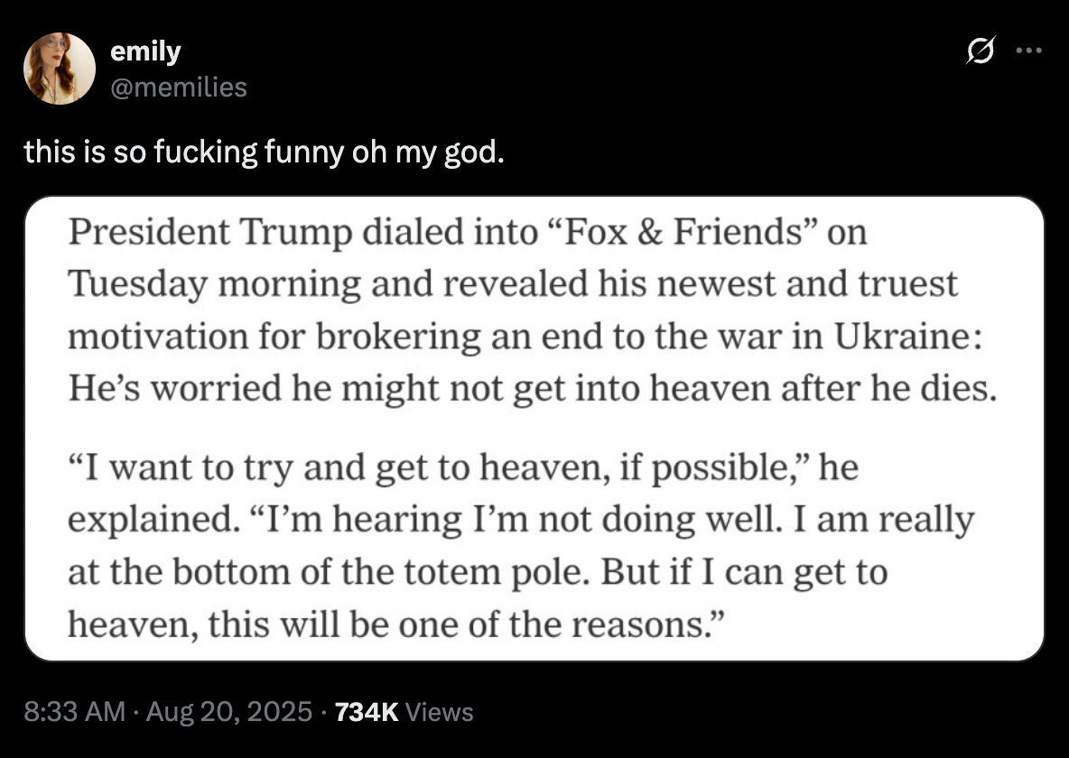I like this, because by the plain meaning of the words, he's saying that the opposite of heaven is "over there," meaning "in a room with Laura Ingraham."