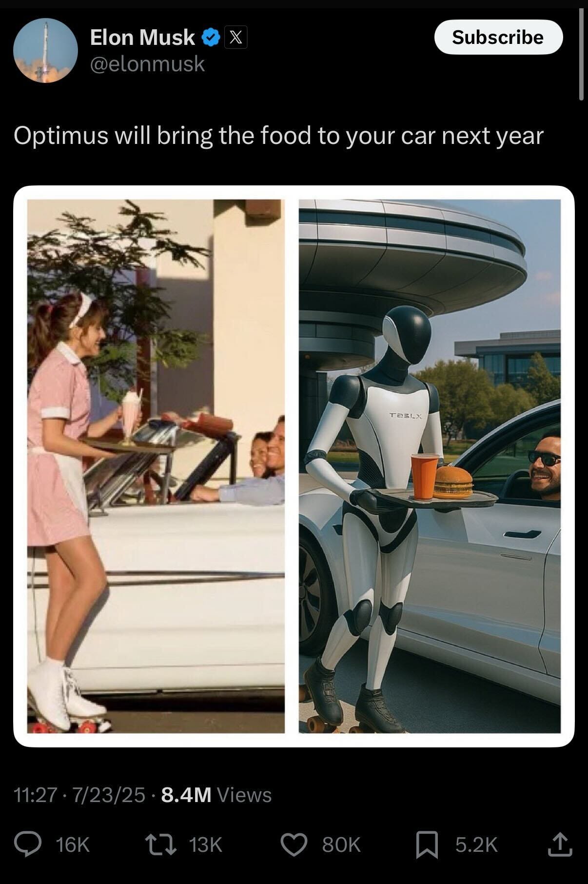 To add the horror pile, Musk tweeted, about the carhop comparison photo, “We could put Optimus in a cute outfit too :)"